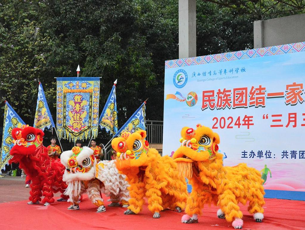 活动在舞龙舞狮、壮拳展示、山歌对唱、民族服装秀、竹竿舞等欢乐的节目中拉开序幕。同学们身着色彩鲜艳、各具特色的民族服饰载歌载舞,向观众们展示了“广西三月三”浓郁的民族风情和具有独特魅力的广西民族文化。表演结束后,学校党委副书记邱团宣布活动正式开幕。