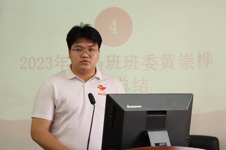 青马班班委黄崇桦作总结发言说到:“来自各学院的65名优秀的学子,在思想学习中能讲政治,树理想,不断丰富自己的内涵;在热情服务的过程中厚植了家国情怀和社会责任感,在每一个平凡的工作岗位上践行强国有我的铮铮誓言,为国家繁荣和社会发展贡献自己的力量。”