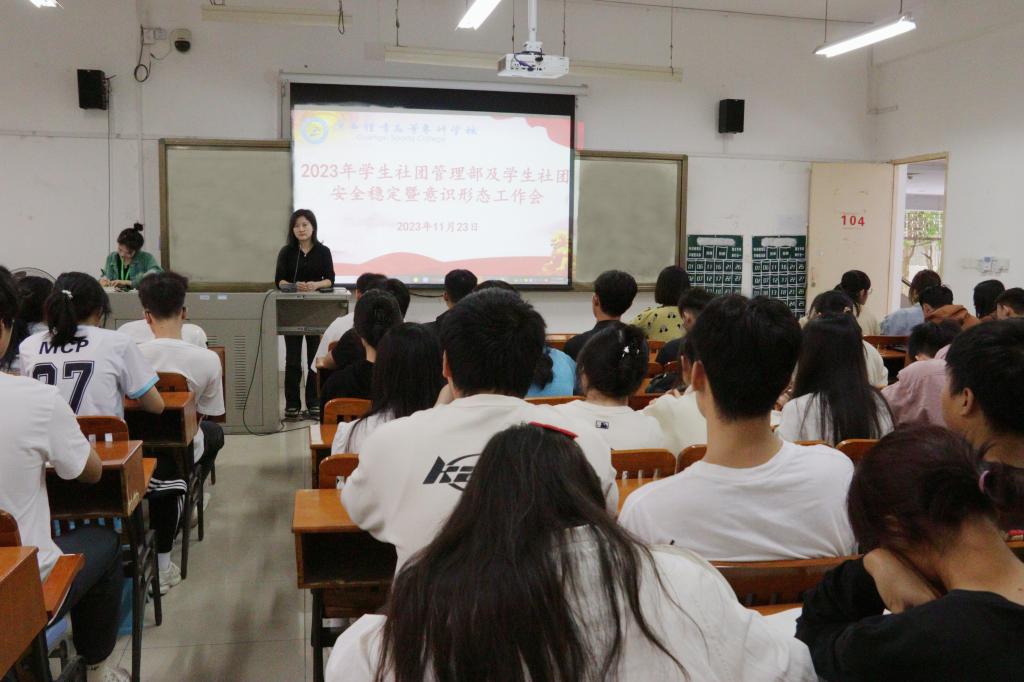 11月23日中午,我校团委在长岗校区瑞兴楼104教室开展2023年学生社团管理部及各社团安全稳定暨意识形态工作会议。本次会议由学生社团管理部部长范程程老师主持,学生社团管理部全体工作人员及学生社团负责人参加会议。