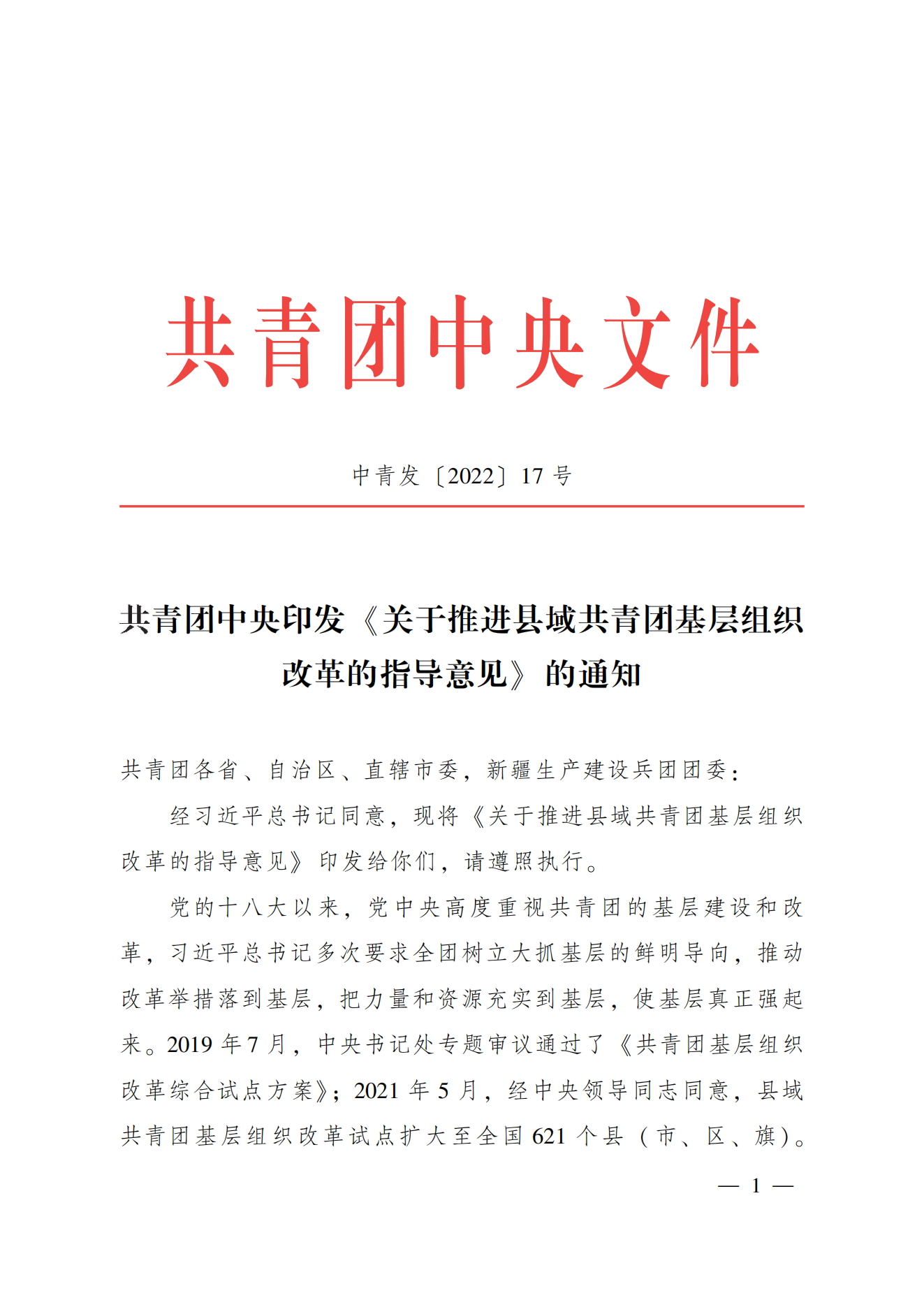 共青团中央印发《关于推进县域共青团基层组织改革的指导意见》的通知