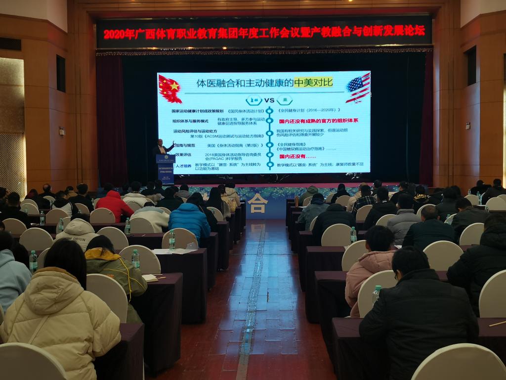 当天下午的论坛上,盛情邀请了广西建设职业技术学院院长吴昆作了主题《产教融合:彰显职业教育类型特征—以广西建设职业技术学院为例》的报告;国家体育总局重点实验室主任,国家科技奖评审专家吴昊作了《体医融合与主动健康产业的新趋势》的报告;广西职业技术学院梁裕院长作了《国家示范性职业教育集团培育工作的经验与体会》的报告;广州中科检测技术服务有限公司实验中心室主任王波作了《检测在教育行业中的应用》的报告。四位专家学者从不同的角度分享了体育职业教育集团如何进一步加强产教融合的经验,为参会人员带来了一场丰盛的精神大餐。