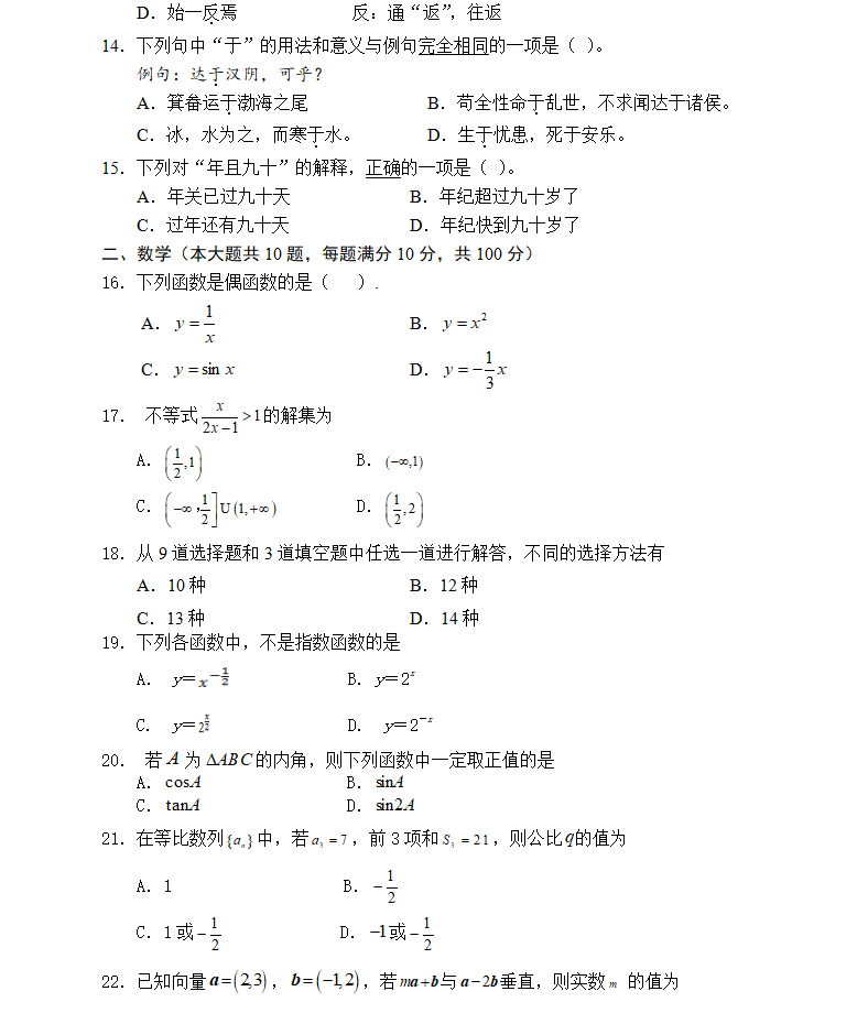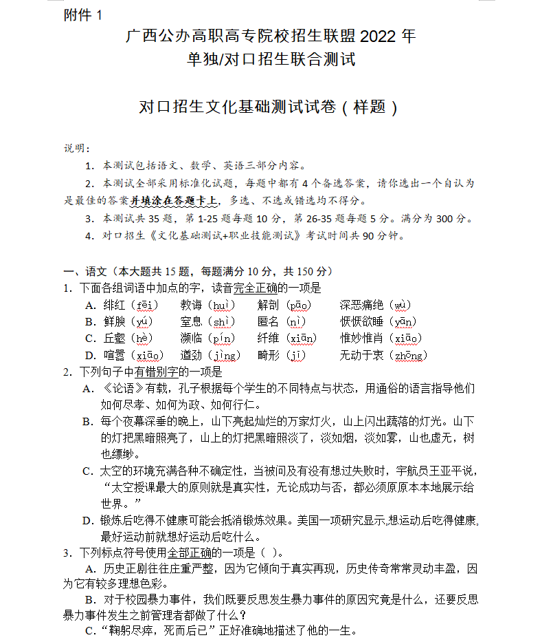 2022年广西公办高职高专院校招生联盟单独/对口招生《文化基础测试+职业技能测试》对口招生考试大纲
